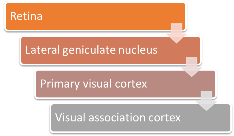 •At the optic chiasm (point in the brain where the optic nerves from both eyes meet and partially cross over) fibres from the nasal retina cross to the opposite (contralateral) side. Temporal fibres stay on the same (ipsilateral) side