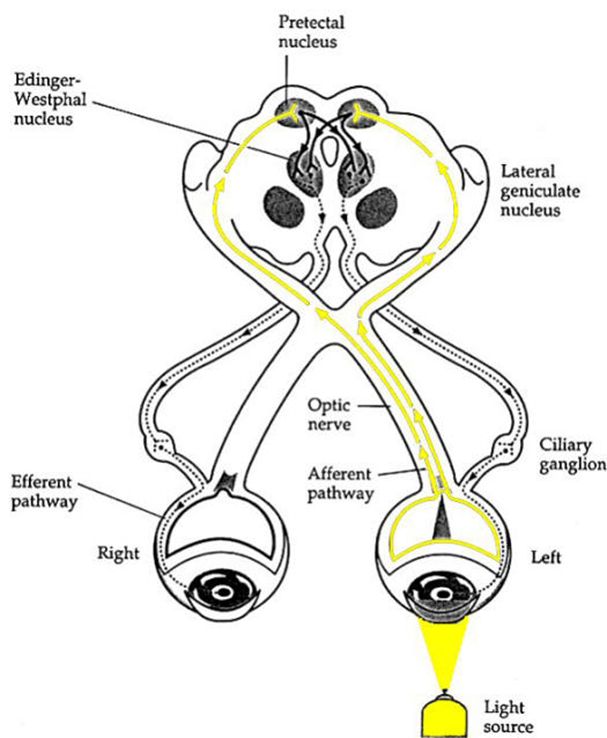 the light reflex consists of an Afferent pathway (Away from the eye), and an Efferent pathway (towards the eye)