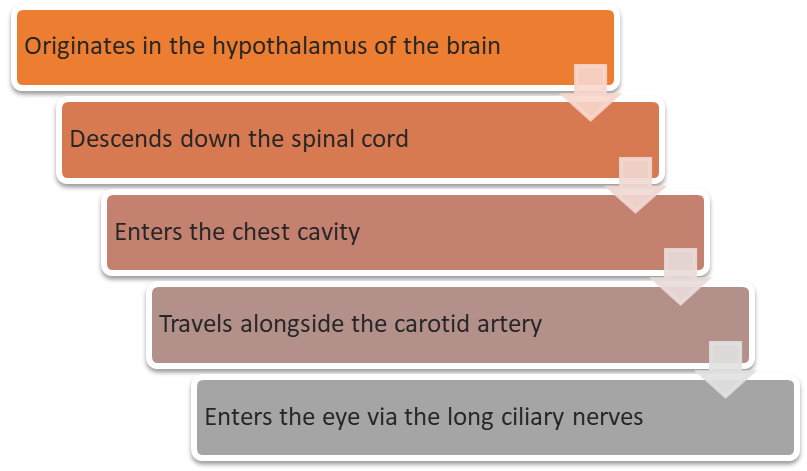 Because the sympathetic pathway to the eye physically passes through the chest and neck