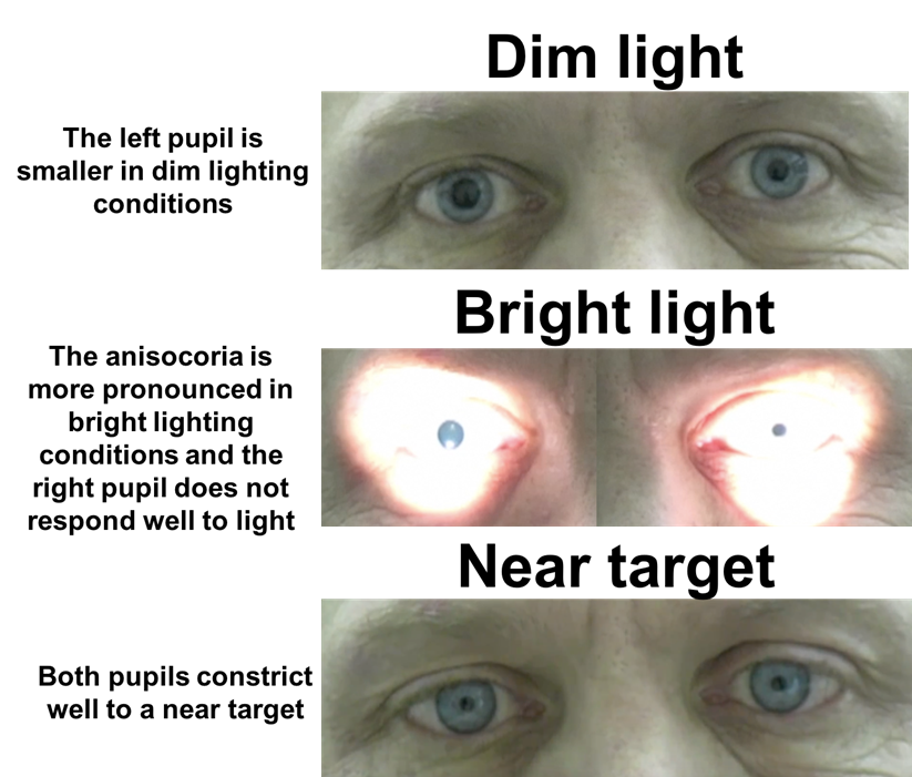 however, under normal lighting conditions both pupils will appear equal (due to the consensual response from the non-affected eye which is still intact)