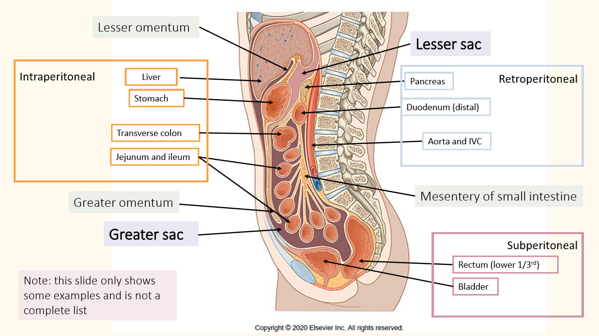 2) Secondary – organs begin as intraperitoneal but migrate behind peritoneum during development