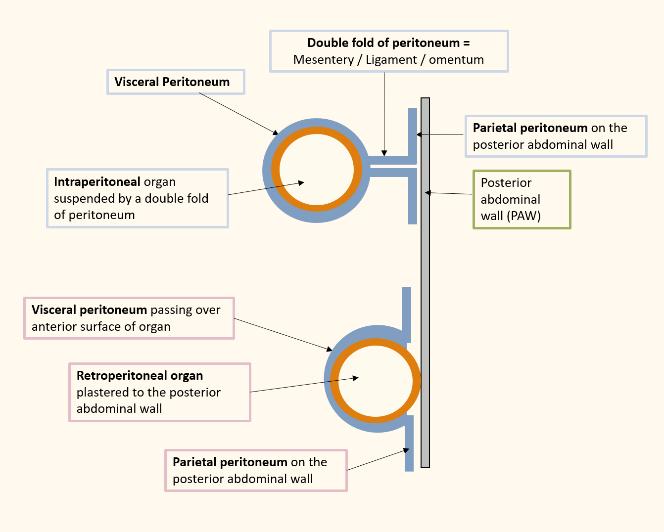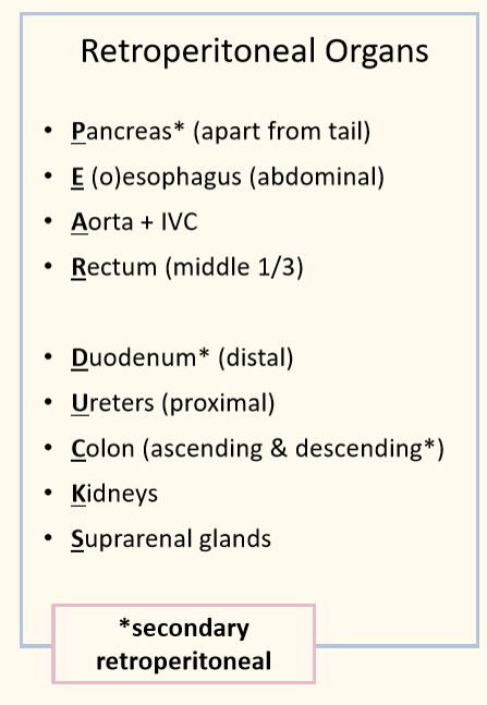 1) Primary – organs develop behind the peritoneum
