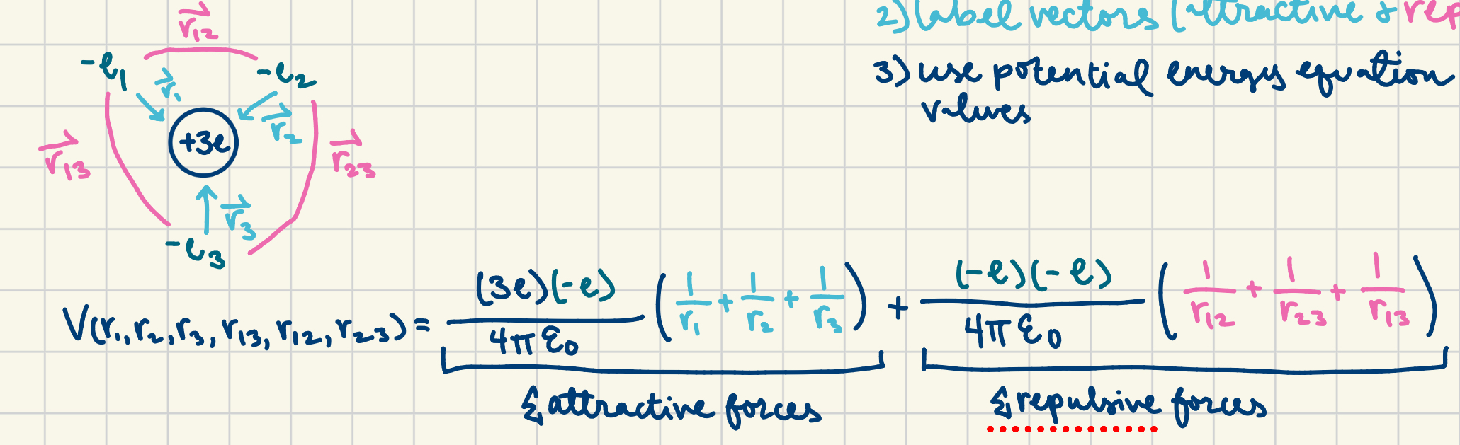 draw configuration, label vectors (attractive and repulsive), use potential energy equation and insert values; make sure to add the attractive forces (as a one section) and the repulsive forces as the other; the more negative the potential energy, the more stable