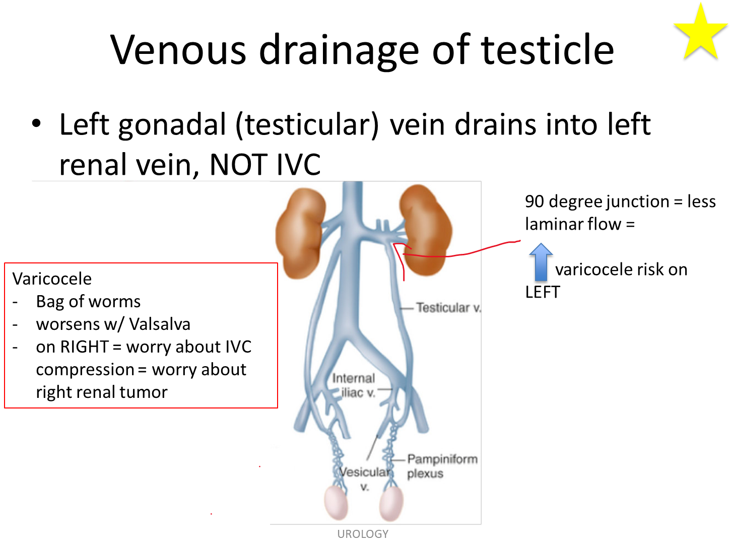 → the left testicle drains into the left gonadal vein to the left renal vein to the IVC