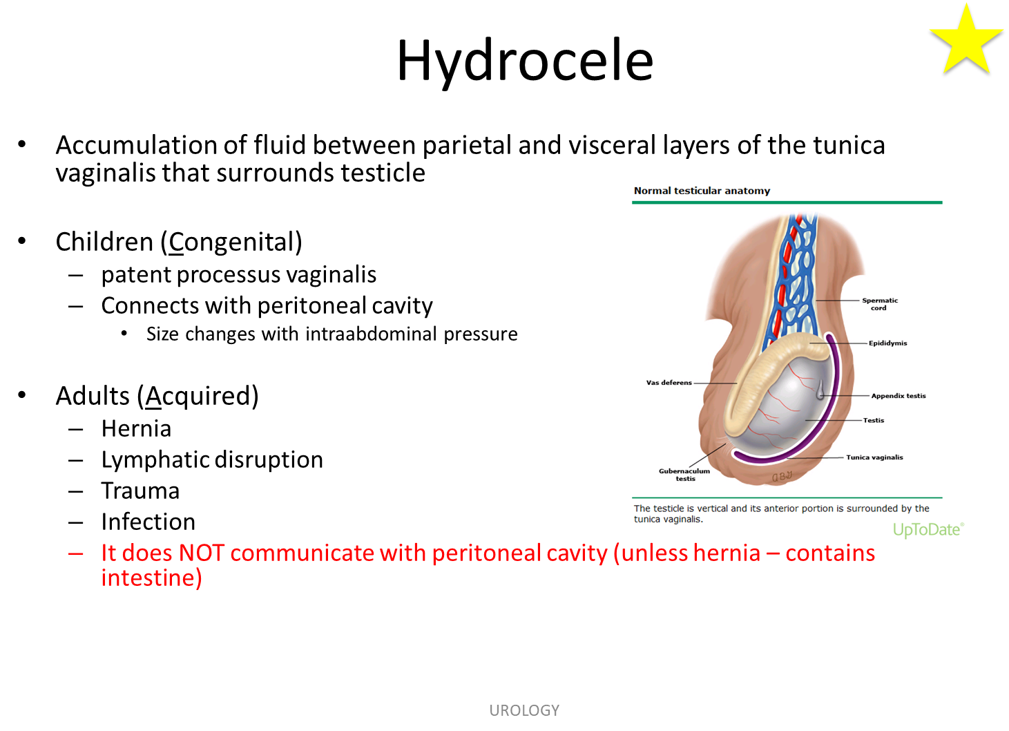 Hydrocele is accumulation of fluid between the parietal and visceral layers of the tunica vaginalis that surrounds the testicle