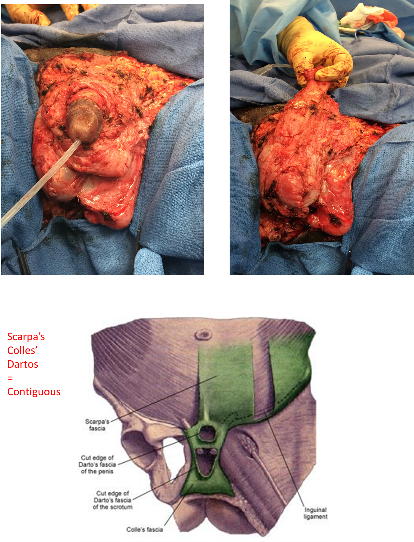 → because it infects the superficial fascial layer, it can have contiguous spread along Colle’s, to Dartos, to Scarpa’s leading to infection spreading up the anterior abdominal wall