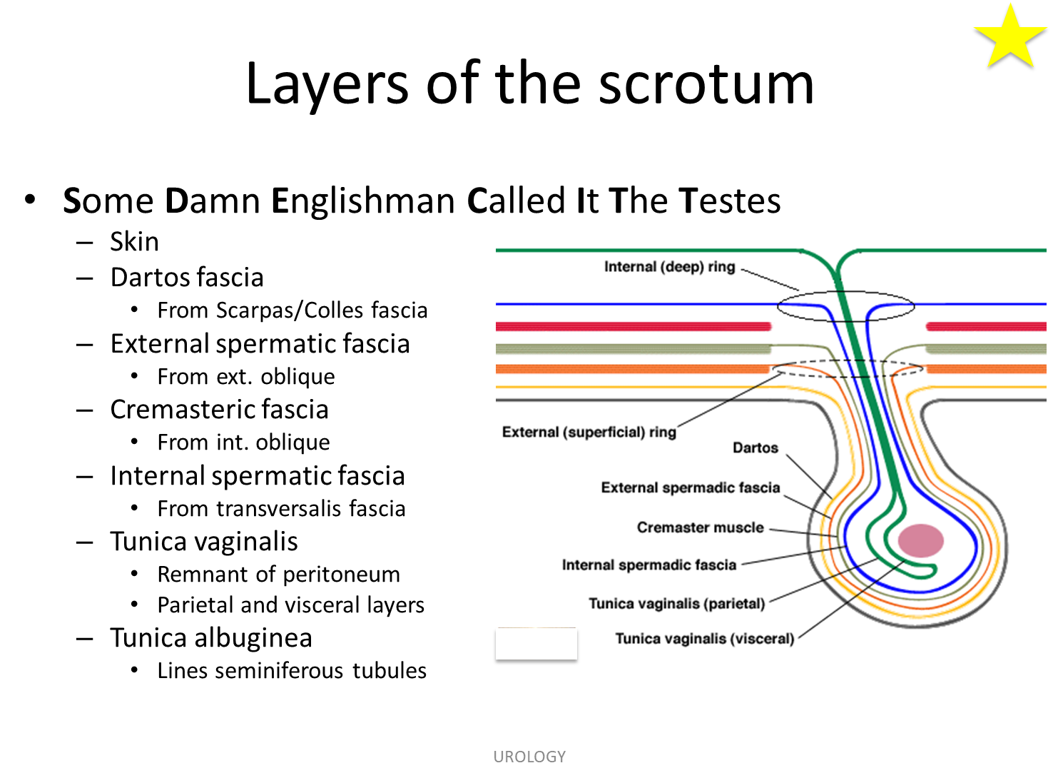 the layers of the scrotum can be named based on: Some Damn Englishman Called It The Testes