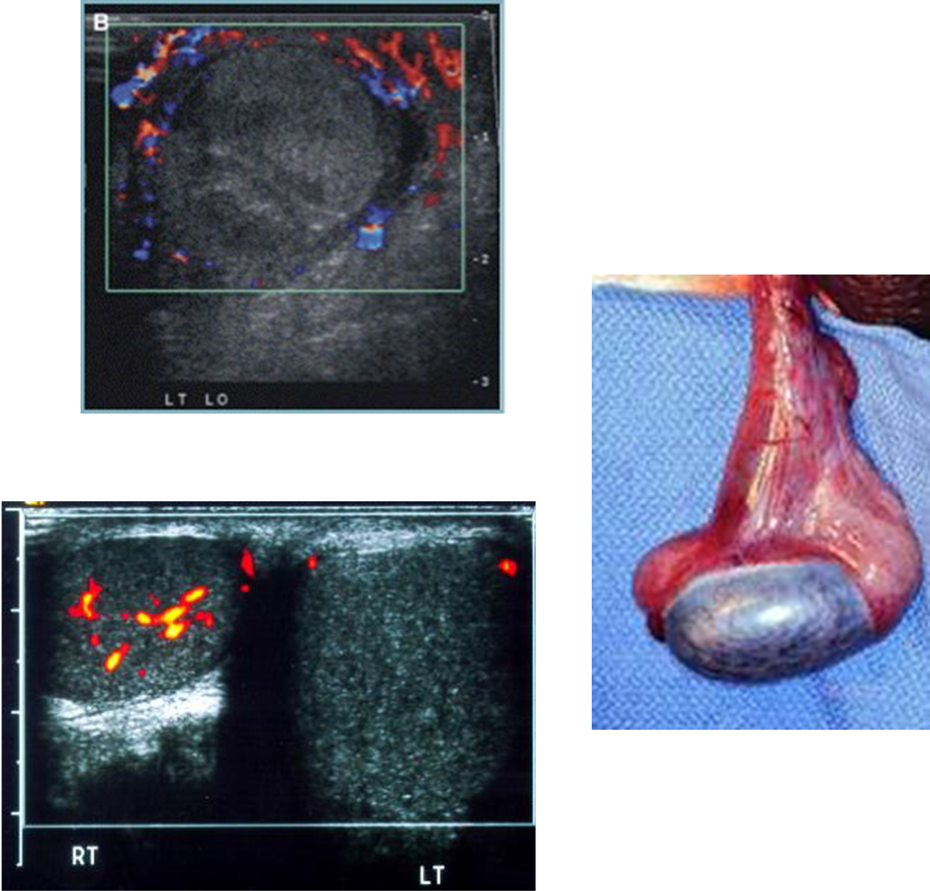 2) On examination will often see absent blood supply to the testis with abdominal pain and GI symptoms but have no fever or urinary complaints