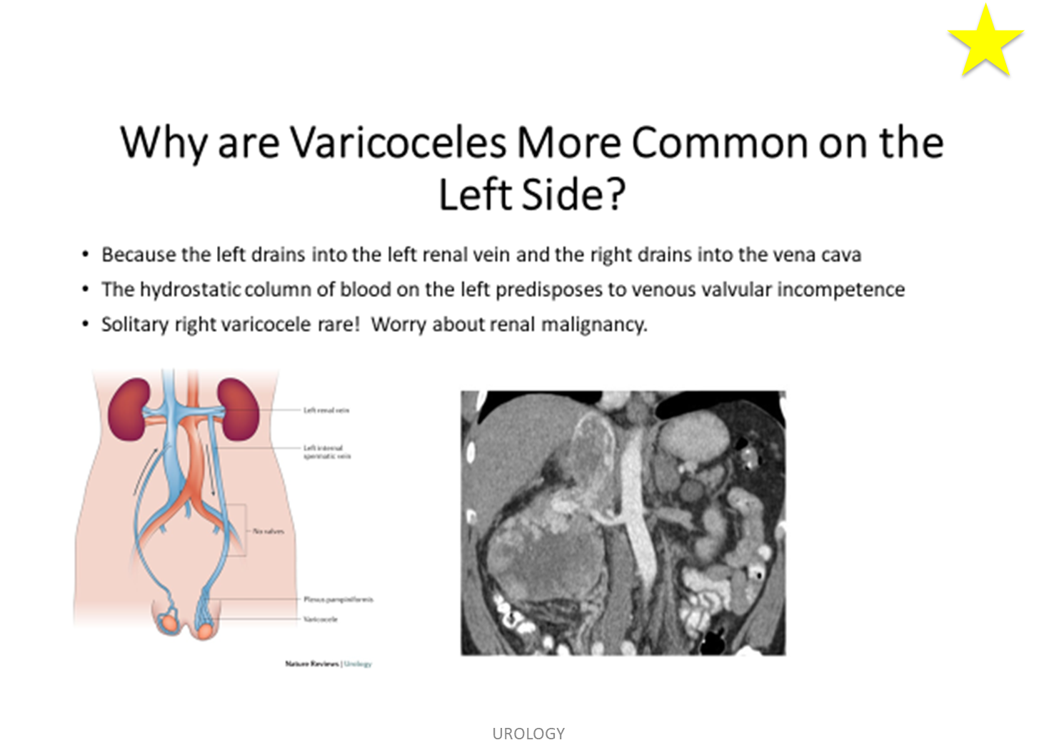 1) It is far more common on the left side due to the left gonadal vein’s drainage pattern into the left renal vein at a 90 degree angle