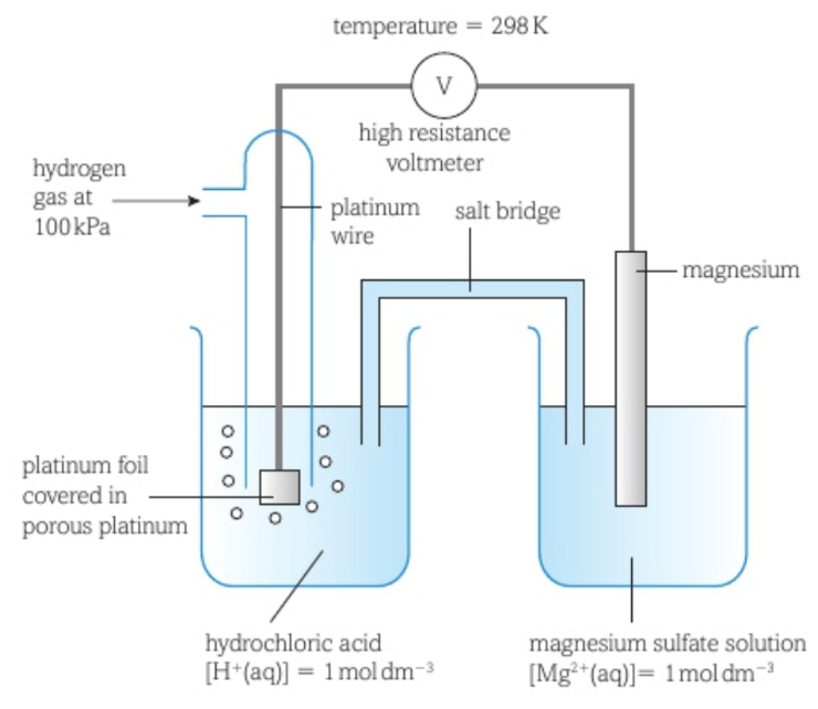 It consists of hydrogen gas at a pressure of 100kPa bubbling over a piece of platinum foil dipped into a solution of hydrochloric acid with a hydrogen ion concentration of 1 mol dm-3 at a temperature of 298K.