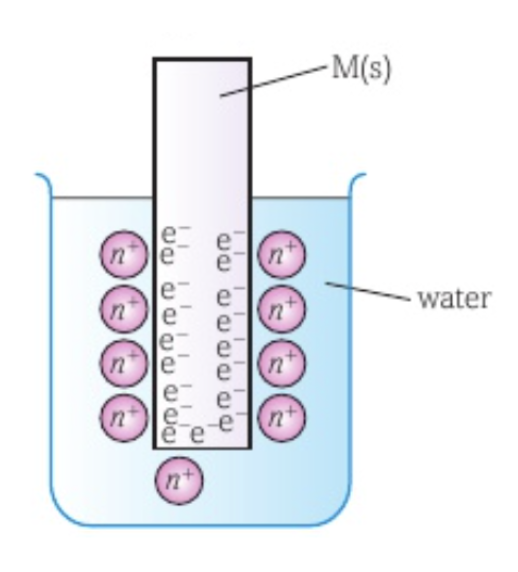 When a metal is placed in water, some metal atoms lose an electron to form positive ions that are released into the solution.
