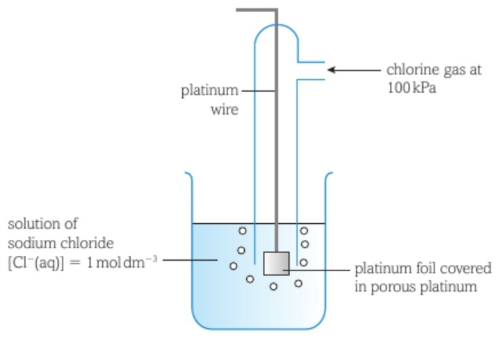 The chlorine half-cell consists of a piece of platinum foil with porous platinum on the surface dipped in a solution containing chloride ions with chlorine gas bubbling over the foil.