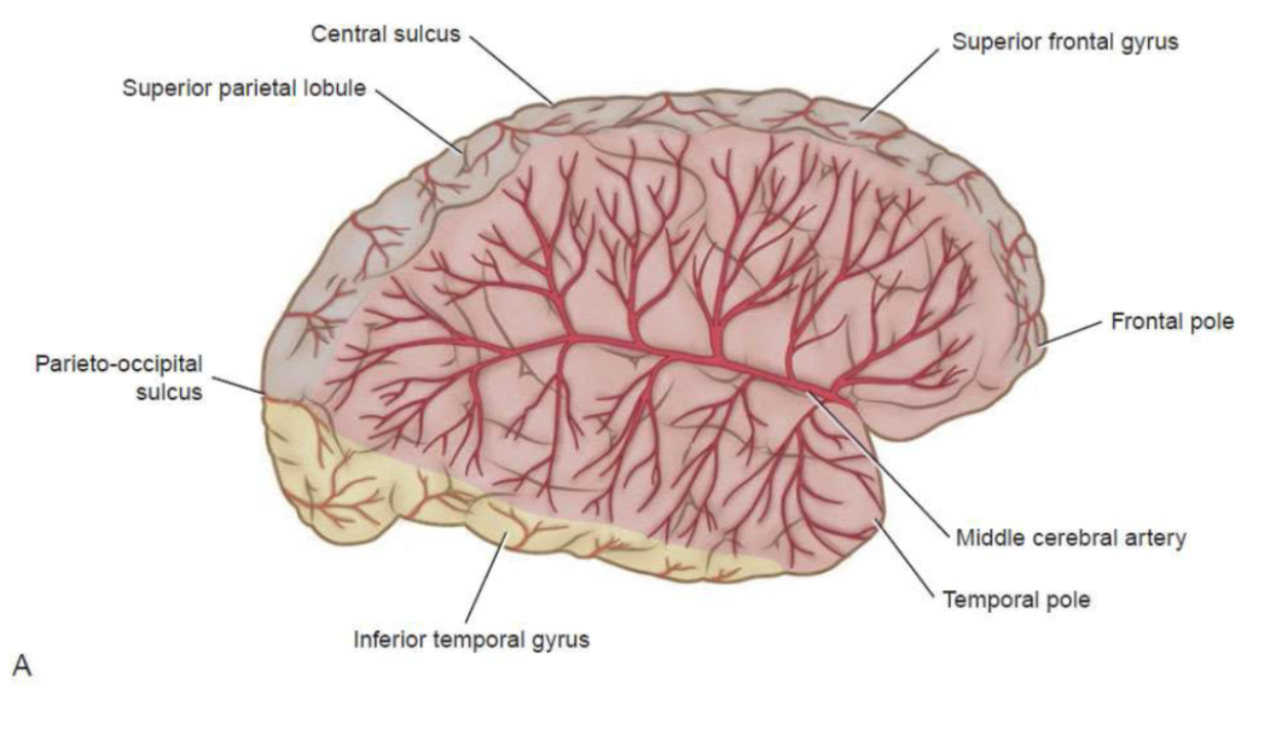 Middle cerebral artery (MCA), anterior cerebral artery (ACA), and posterior cerebral artery (PCA).