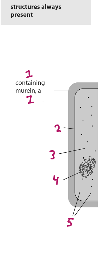 cell wall, peptidoglycan, cell membrane, cytoplasm, circular DNA, ribosomes