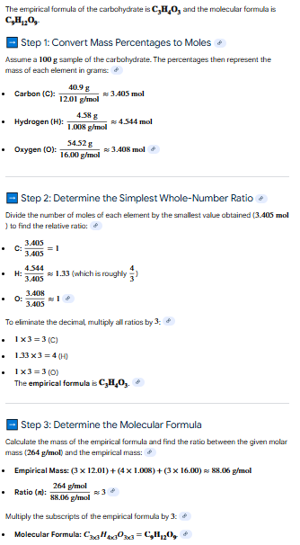 What are the EMPIRICAL & MOLECULAR formulas of a carbohydrate that contains 40.9% carbon, 4.58% hydrogen, and 54.52% oxygen & has a molar mass of 264 g/mol? (pg. 131)