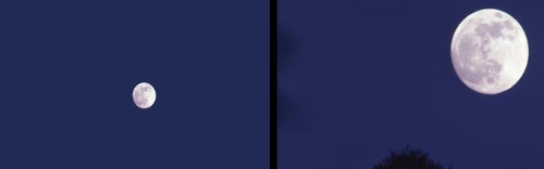 Moon looks FARTHER on the horizon (due to depth cues like trees and buildings → so brain makes it appearLARGER even though its retinal image size stays the same as when it’s overhead