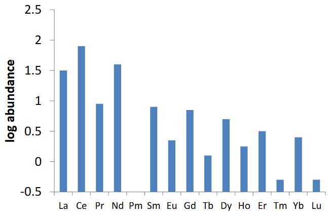 Lanthanides generally get rarer as they get heavier due to decreasing nuclear stability.