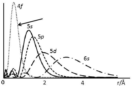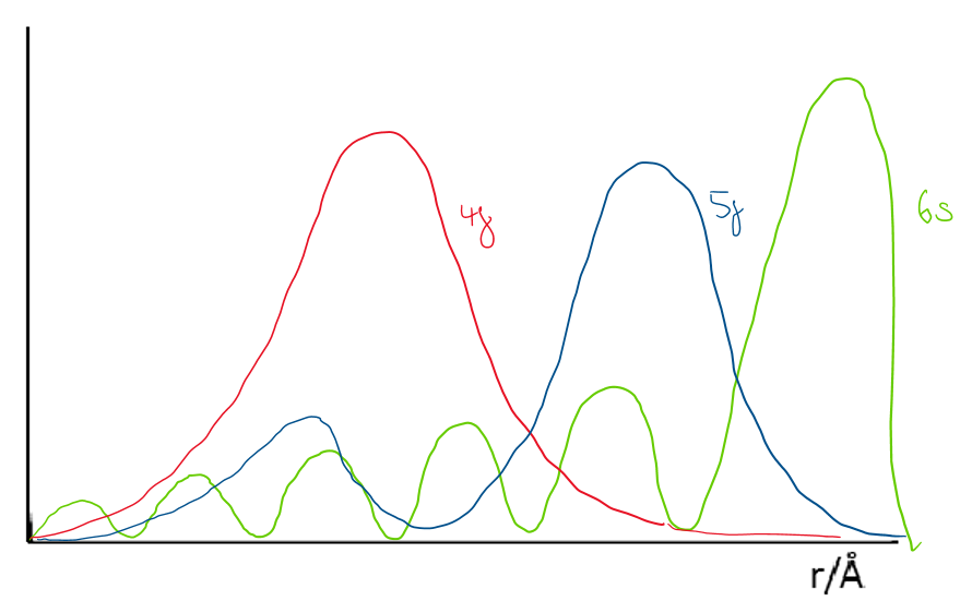 Draw a radial distribution plot to demonstrate the differences between the 4f, 5f and 6s orbitals and describe the key features.