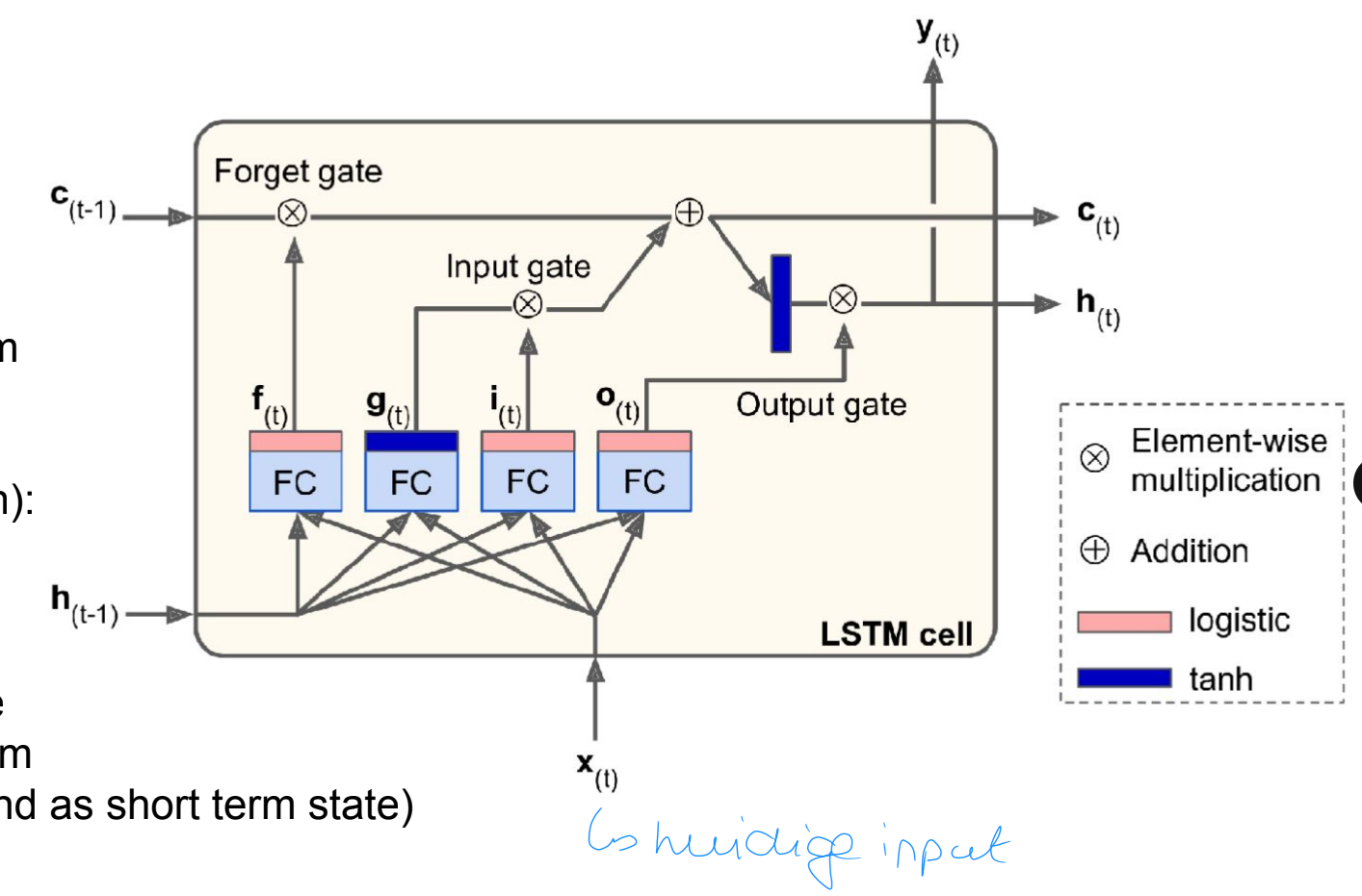 Cell gate g(t) (tanh activatie) berekent een functie van de input en huidige short term state h(t−1)