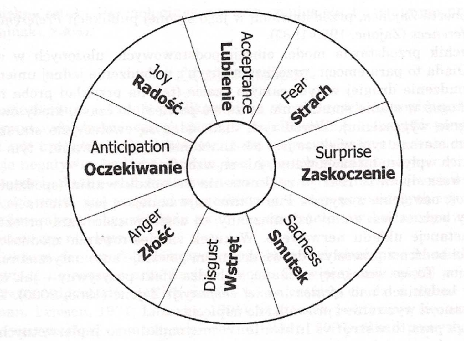 Plutchik wymienia osiem emocji podstawowych - pierwotnych i uniwersalnych (pierwotnych w filo- i ontogenezie) ułożonych w cztery diady.