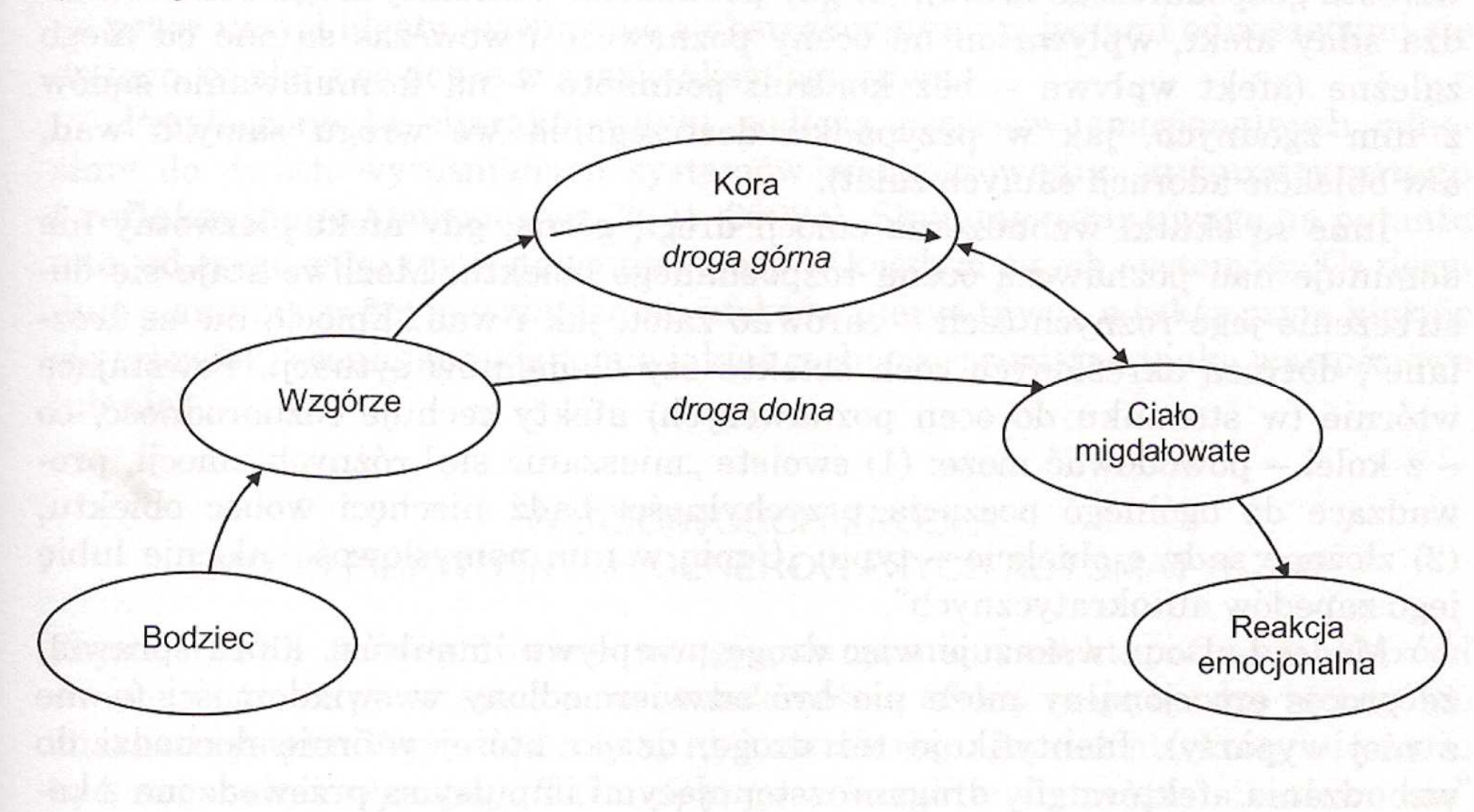 (2) afekt powstaje automatycznie i bezwiednie wskutek pobudzenia ciała migdałowatego, a jego odczucie pojawia się, o ile impulsy zostaną przekazane z ciała migdałowatego do odpowiednich obszarów kory mózgowej;