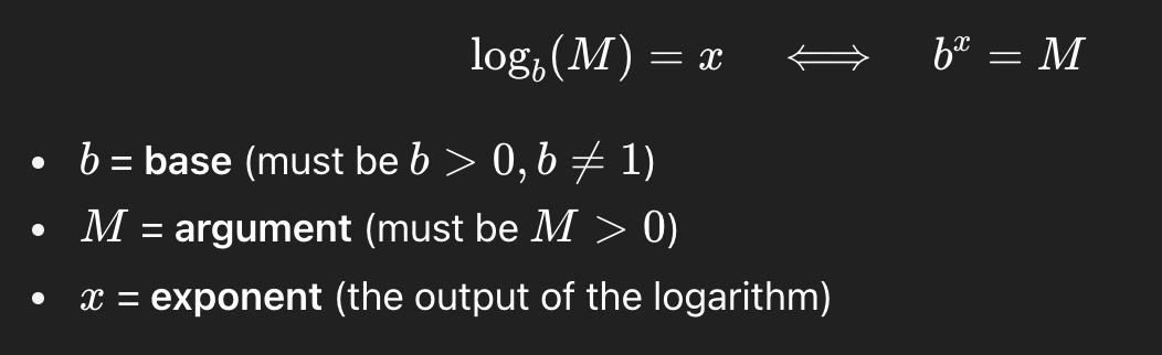 \quad \log_b\!\left(M^p\right) = p \cdot \log_b(M)