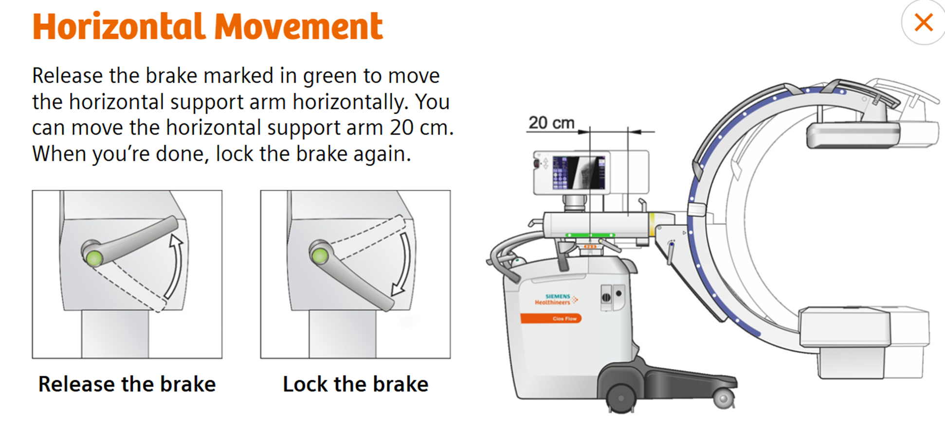 Release the brake marked in green to move the horizontal support arm horizontally. You can move the horizontal support arm 20 cm. When your done, lock the brake again