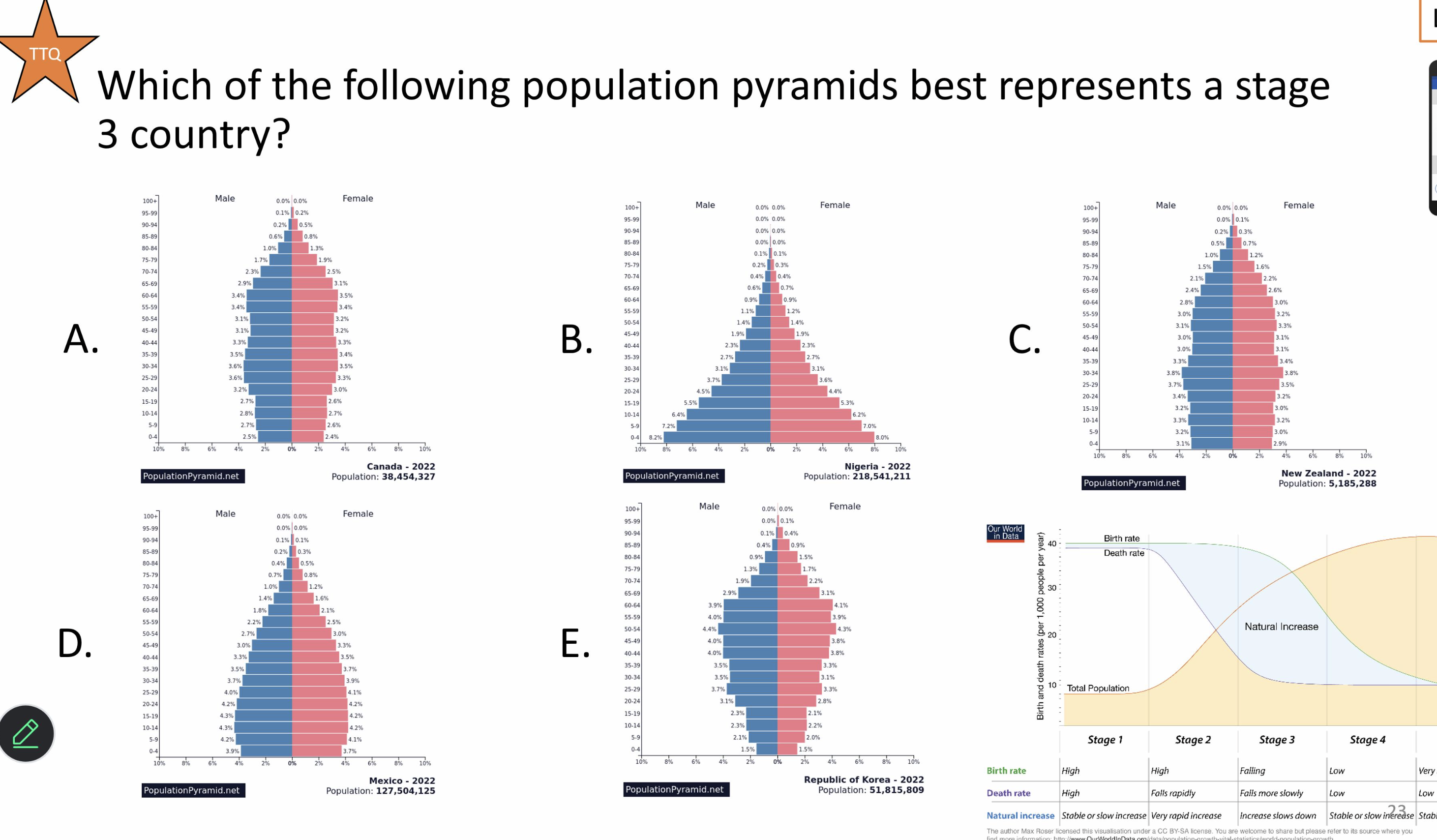 D. stage 3 is when birth rate starts to decline so the sides should be about equal with the bottom line being smallest