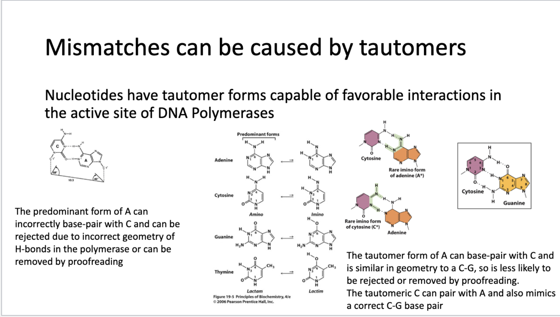 The predominant form of A can incorrectly base-pair with C and can be rejected due to incorrect geometry of H-bonds in the polymerase or can be removed by proofreading The tautomer form of A can base-pair with C and is similar in geometry to a C-G, so is less likely to be rejected or removed by proofreading.