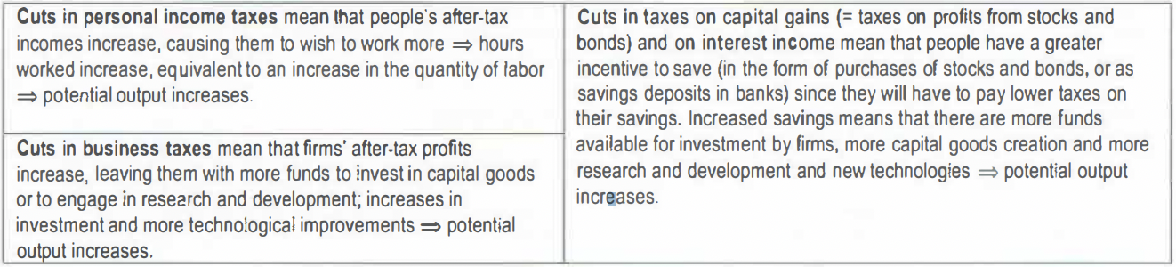 Are policies involving tax cuts, intended to increase incentives of people to work and of firms to invest. As hours worked increase, and as investment increases there is growth in output => potential output increases:
