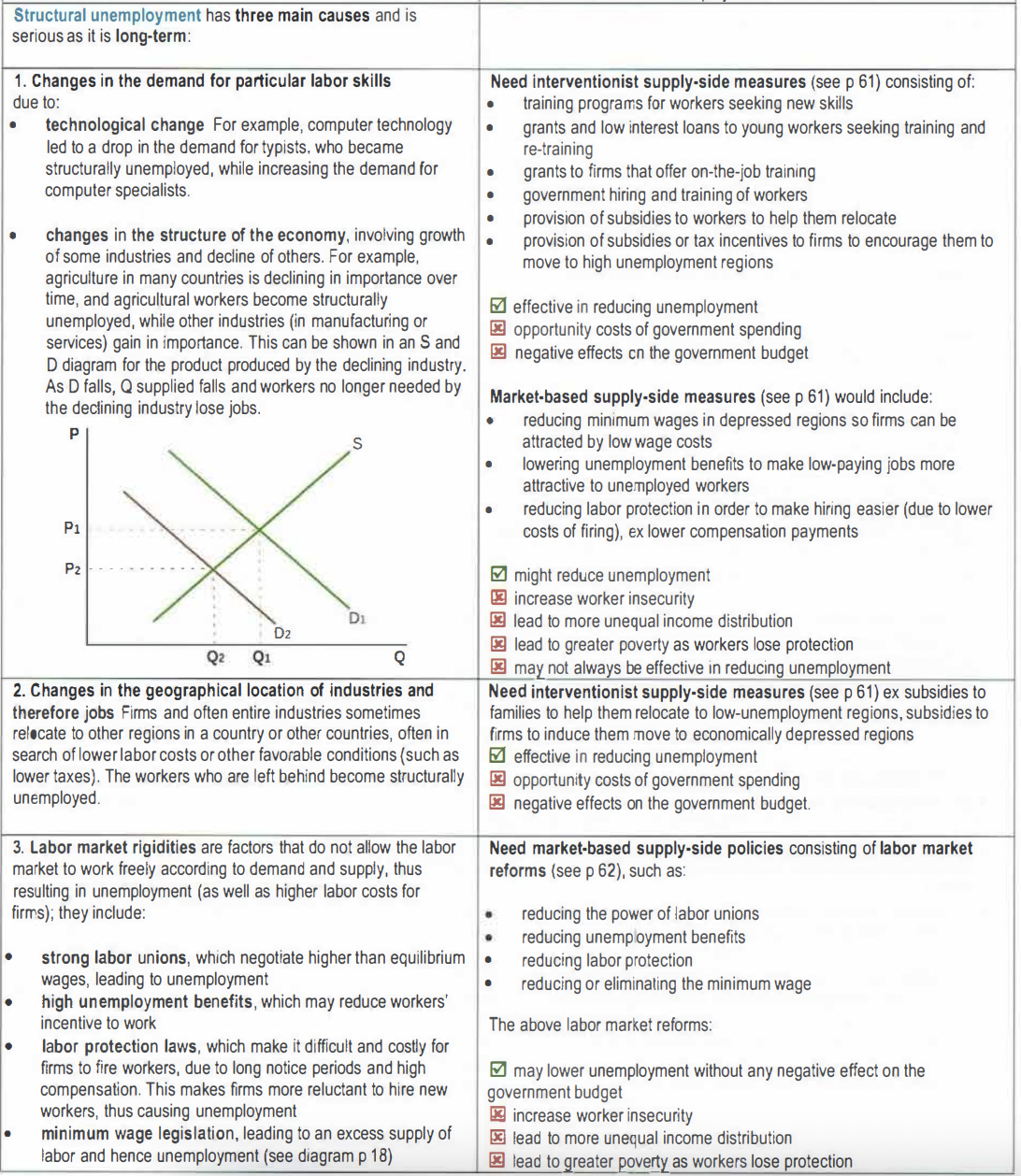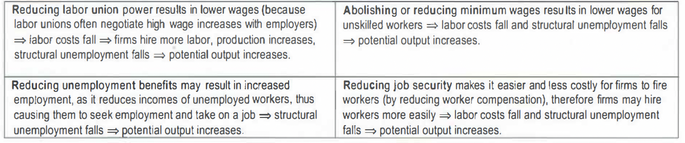 Also known as increasing labor market flexibility or reducing labor market rigidities, these are intended to increase competition in labor markets, allowing wages to be determined by supply and demand for labor, often lowering labor costs for firms and leading them to hire more labor; these policies may also reduce structural unemployment (remember that one cause of structural unemployment is labor market rigidities; see p 49) :=) potential output increases: