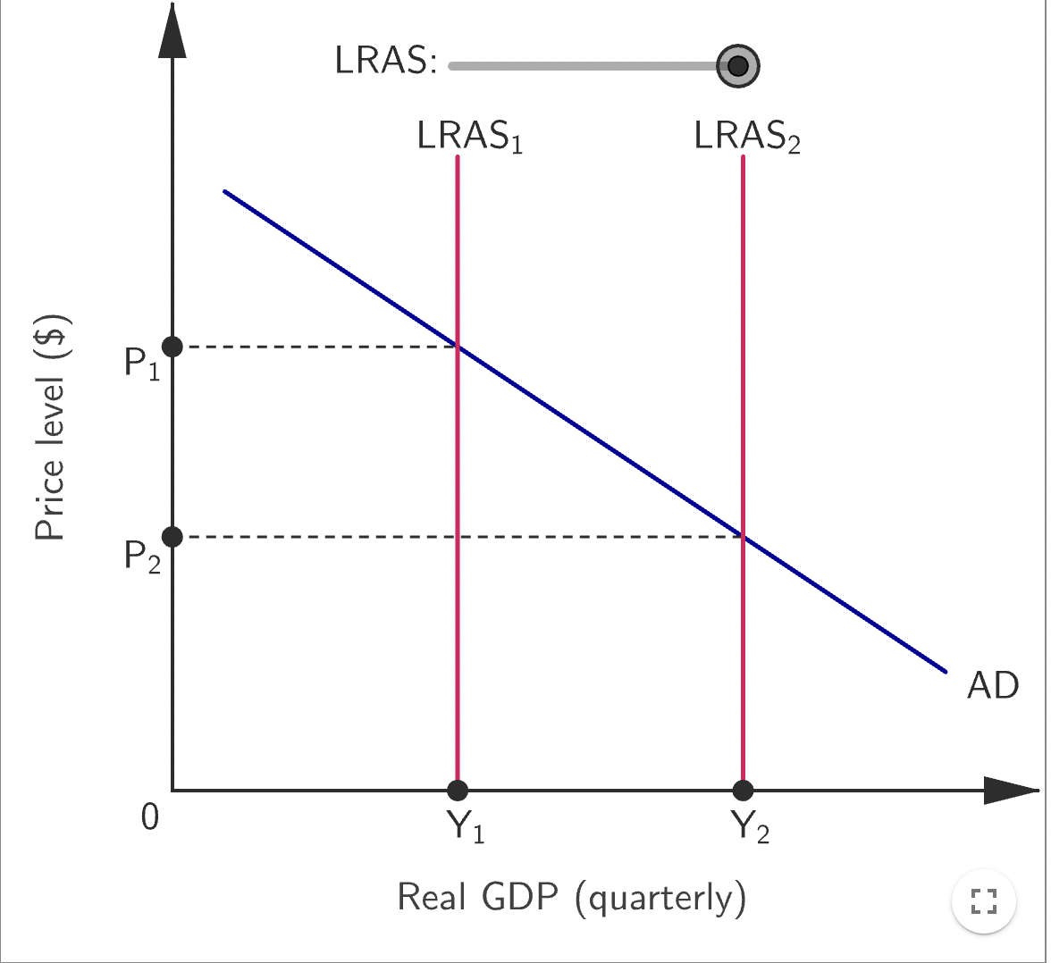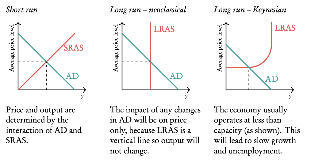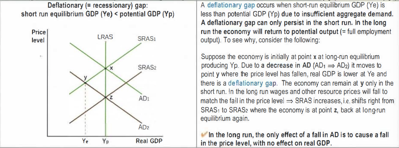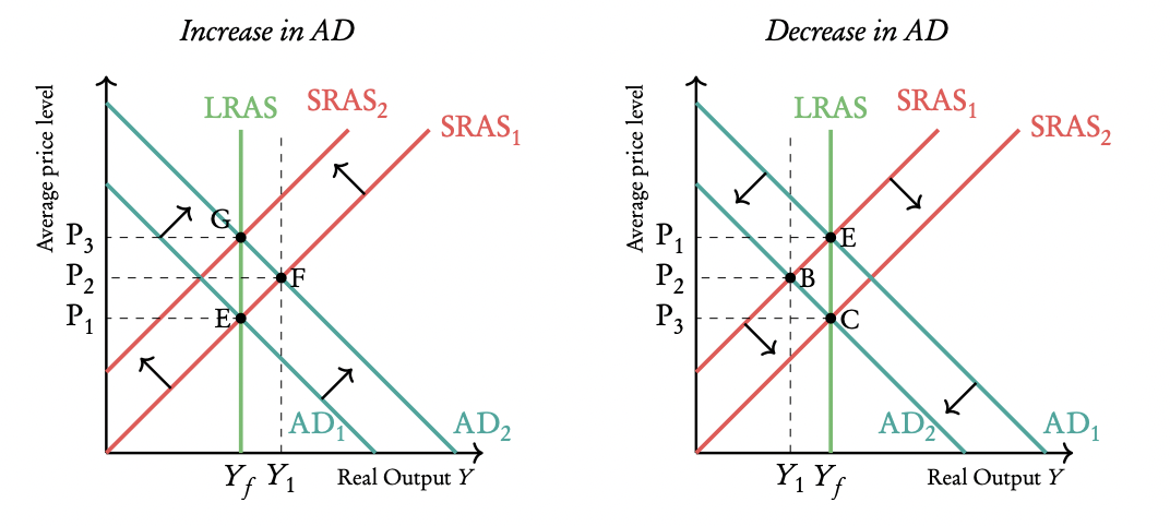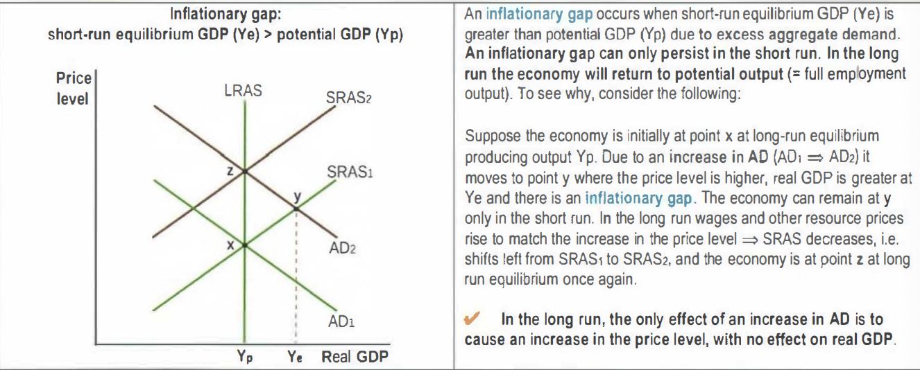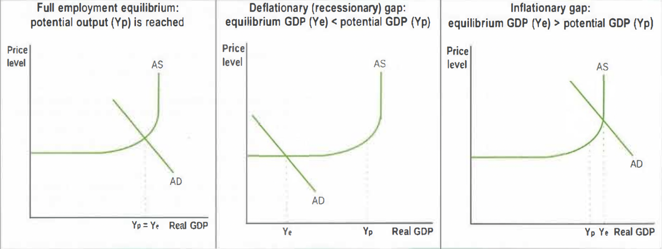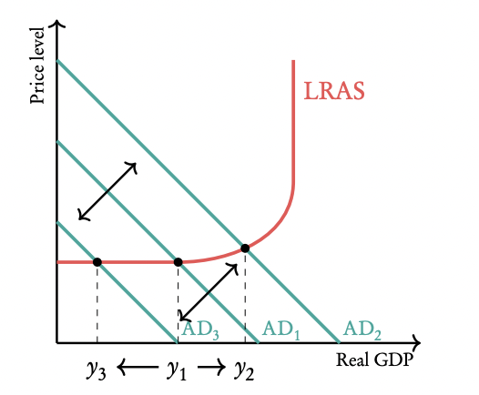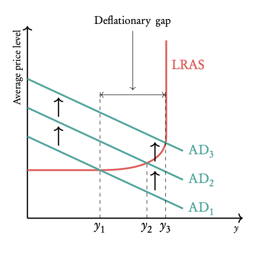 If the economy is far from full capacity (Y1), increased demand (AD1 to AD2) boosts GDP without significant inflation (e.g., Denmark’s 1% inflation despite expansionary policy).