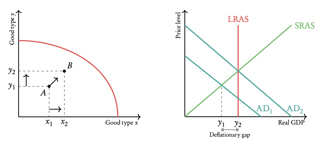 Efficiency: Point H illustrates unemployment of resources, or inefficient use of resources. By using the factors of production more efficiently, the economy could move closer to the PPC, increasing its output of agricultural output and manufactured goods. Any points underneath the PPC are possible, but would indicate a lack of efficiency, and some waste of resources.