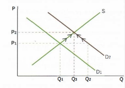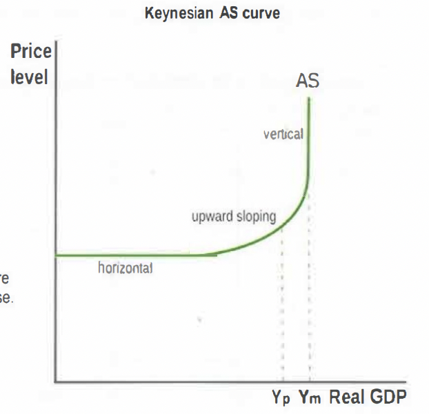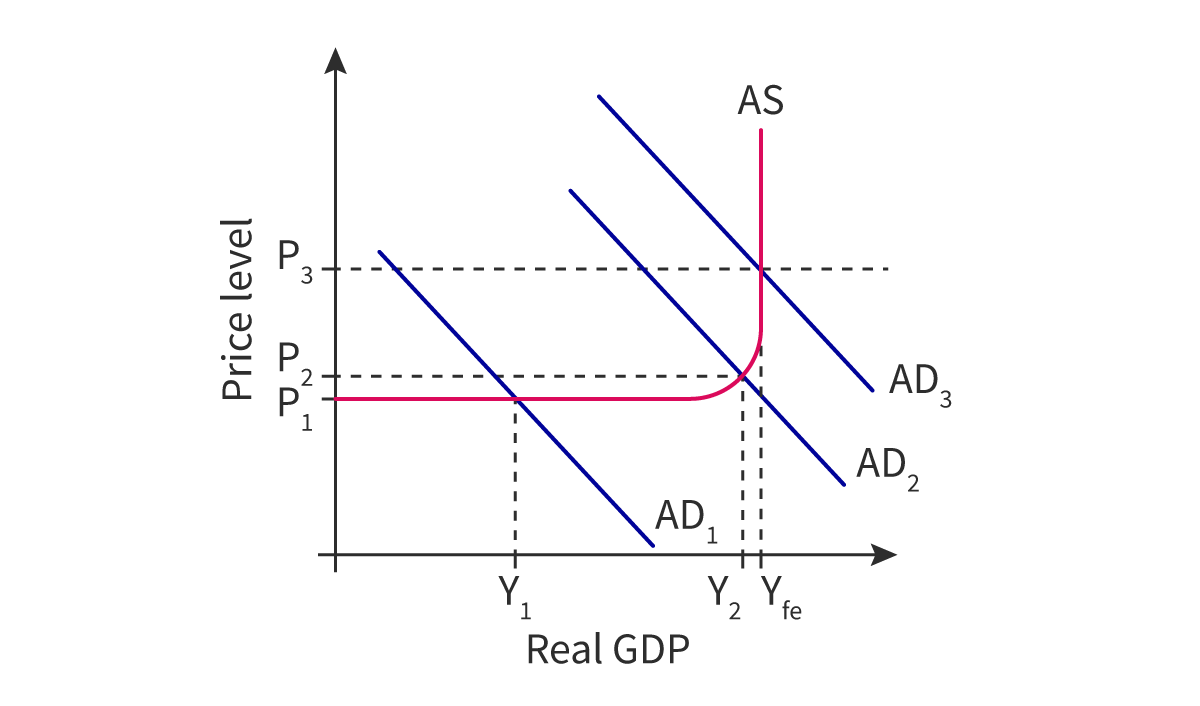 If the economy is near full capacity (Y2), further expansion leads to higher prices (P2 to P3) because of competition for factors of production.
