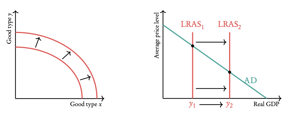 If there is an improvement in the quality or an increase in the quantity of the factors of production, or technological advancements, then the PPC would shift outwards