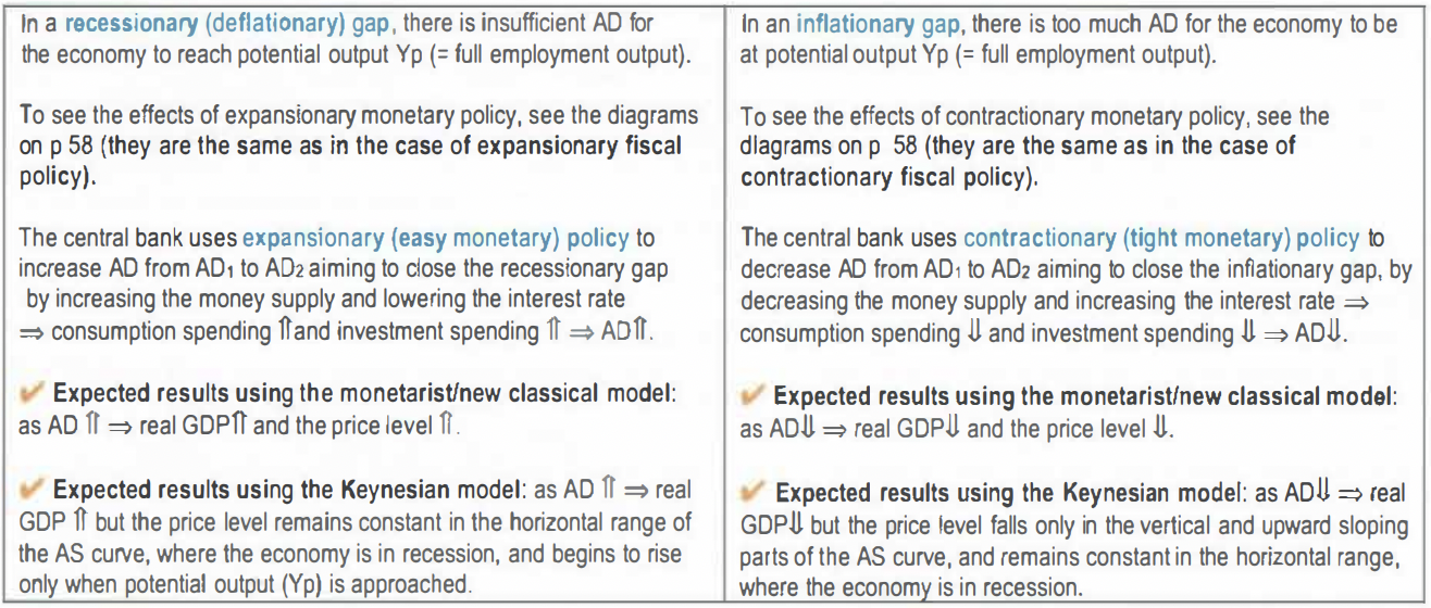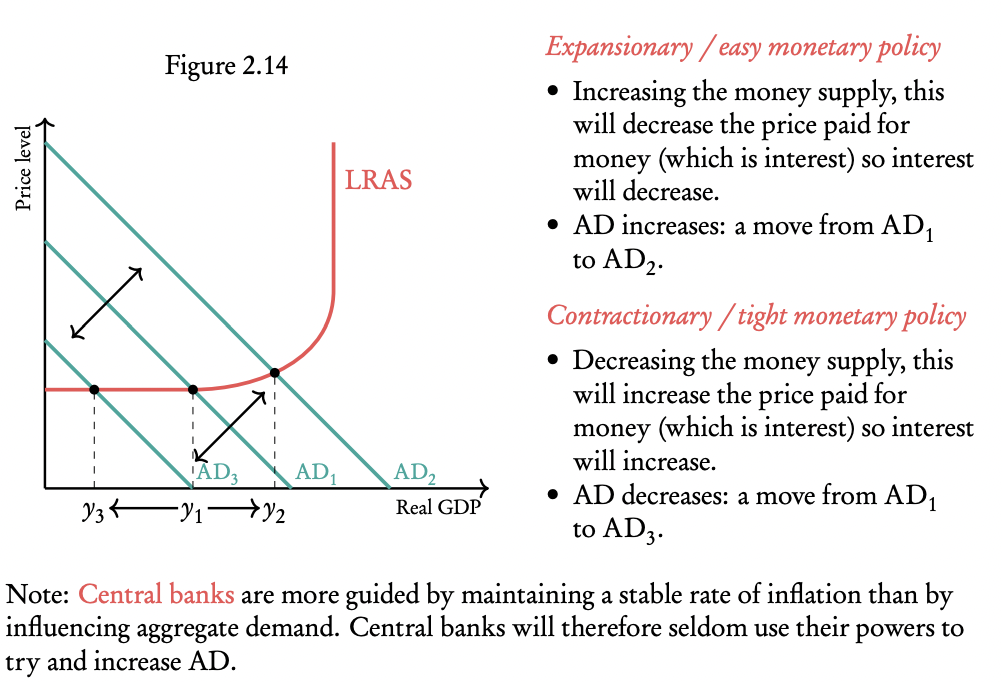 Monetary policy, managed by the central bank, influences aggregate demand (AD) to help achieve economic stability. The key goals include: