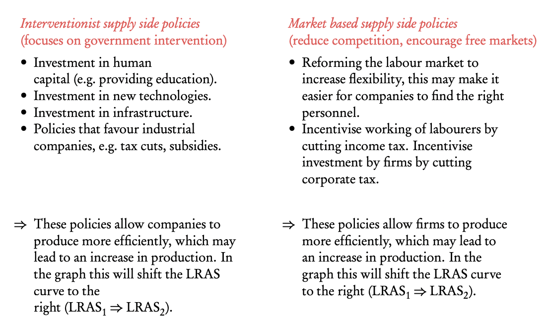 Supply side policies government intervention by affecting the production side of the economy ⇒ changing the quantity or quality of the factors of production