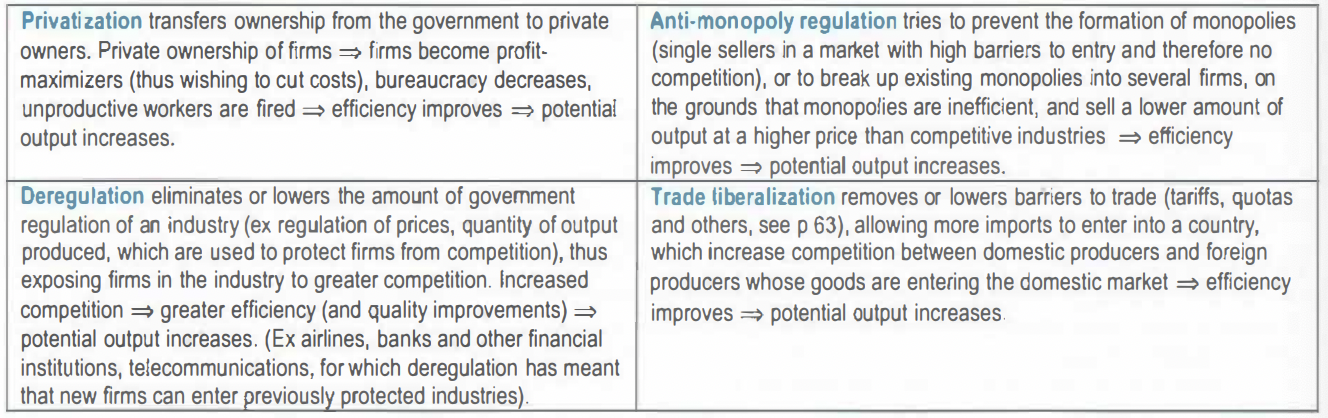 Are based on the idea that greater competition increases efficiency in production and improves resource allocation=:> potential output increases: