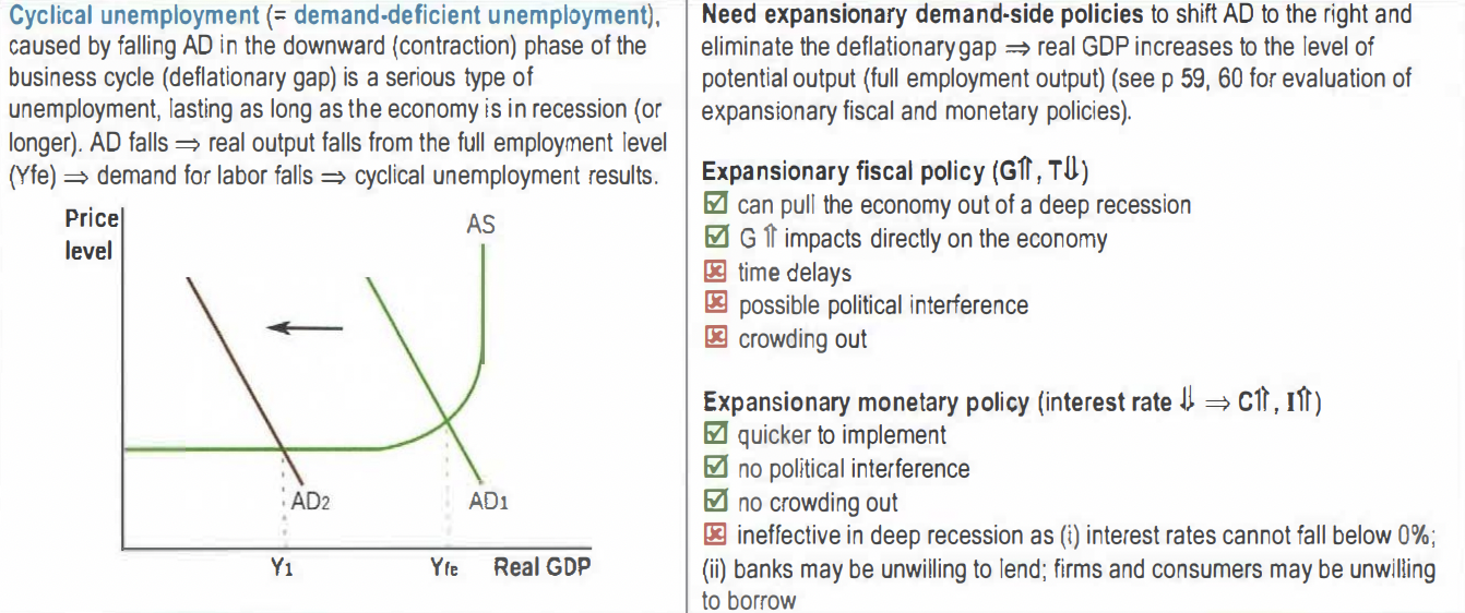 Expansionary fiscal policy can stimulate aggregate demand to reduce unemployment. At full employment (Yfe), all factors of production are fully utilized, maximizing GDP.