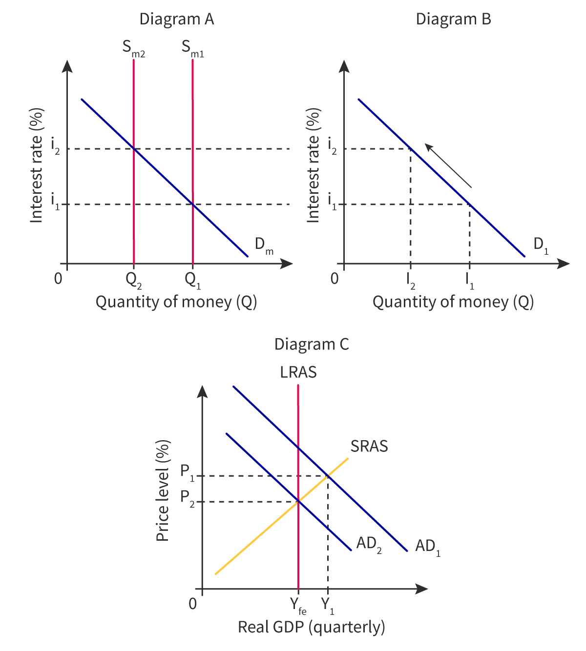The money supply decreases (Sm1 to Sm2), interest rates rise (i1 to i2), and investment falls (I1 to I2), reducing aggregate demand (AD1 to AD2) and the price level (P1 to P2).