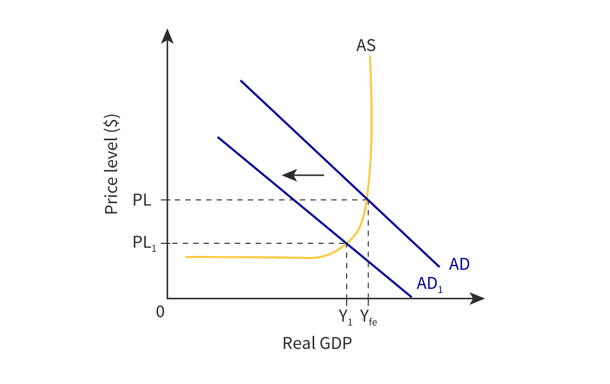 This leads to a reduction in real GDP (Y1 to Yfe), restoring economic stability.