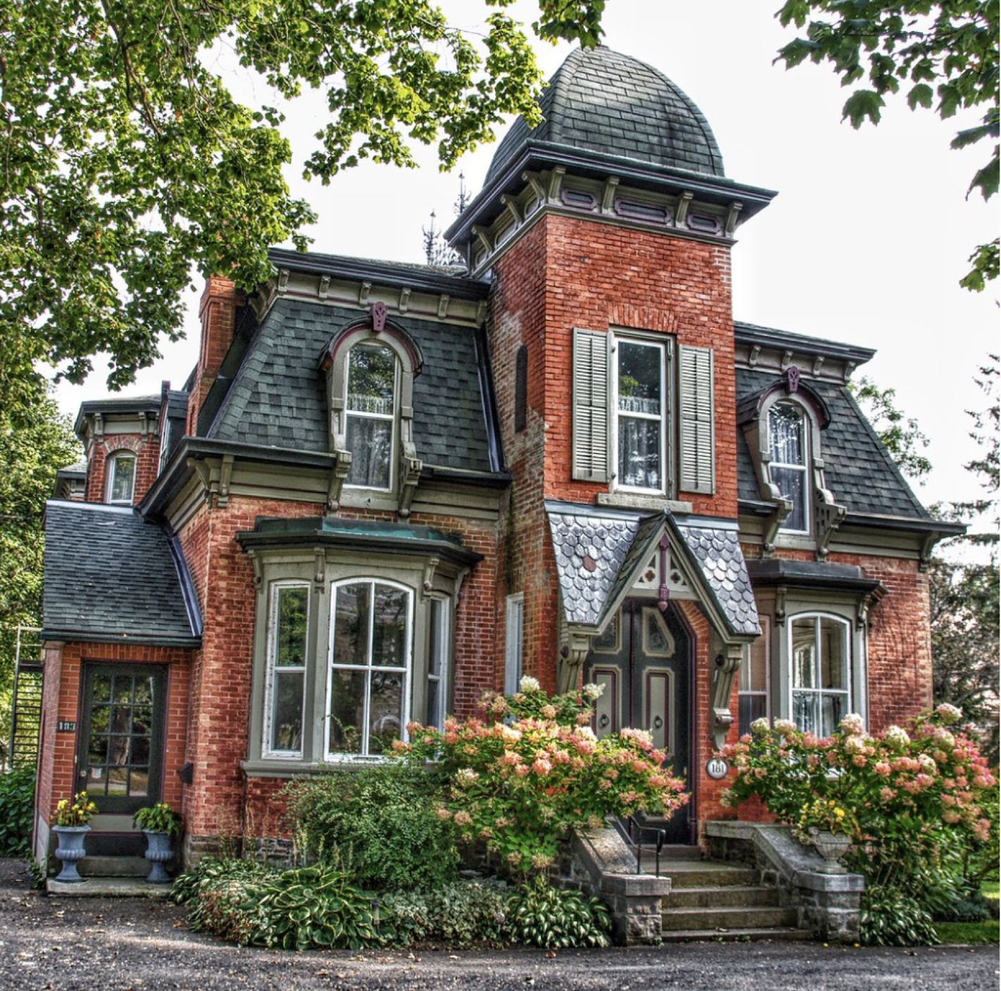 queen anne (victorian): tower/turret, asymmetrical, pitched roof of irregular shape