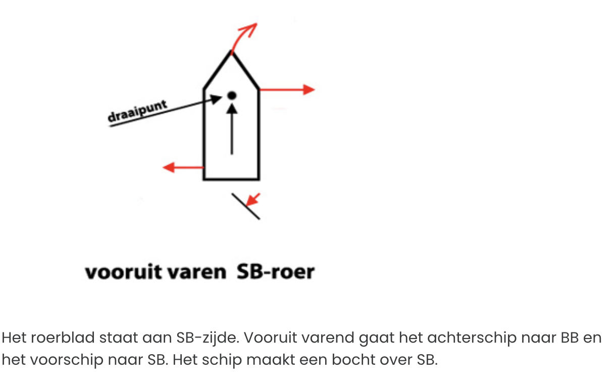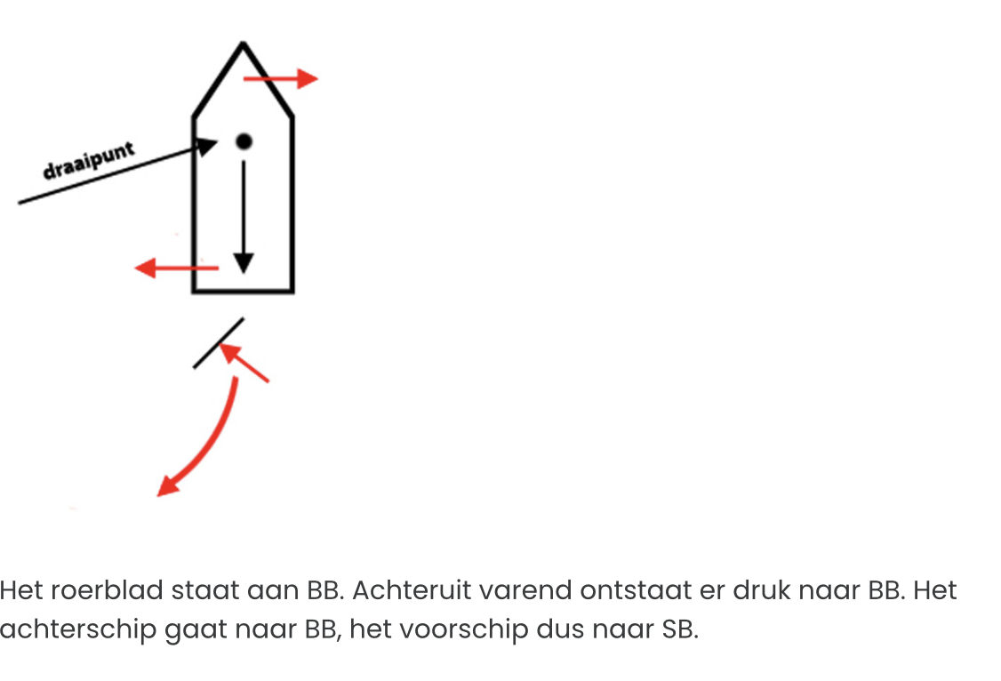 Als het roerblad schuin staat op de vaarrichting ontstaat er een zijwaartse druk, die het achterschip opzij duwt. Een roer werkt alleen als er water langs het roerblad stroomt. Dit noemen we de roerdruk. Hoe meer roerdruk, hoe sneller de boot gaat en hoe beter je kunt sturen.