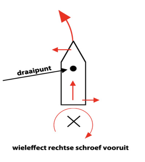 De schroef duwt het schip niet alleen vooruit, maar duwt ook de achterkant van het schip wat opzij.
