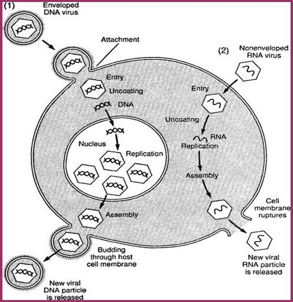 attaches, then penetrates cell, synthesis of nucleic acid and protein