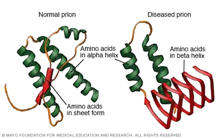 normal prion has no beta sheets, while diseased prion has high beta sheet count