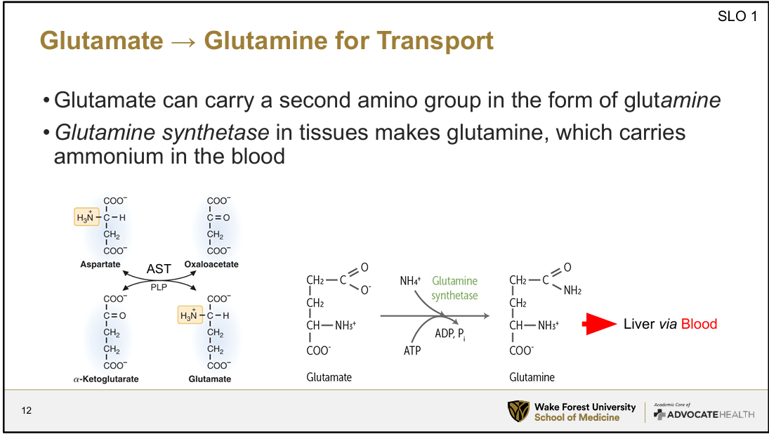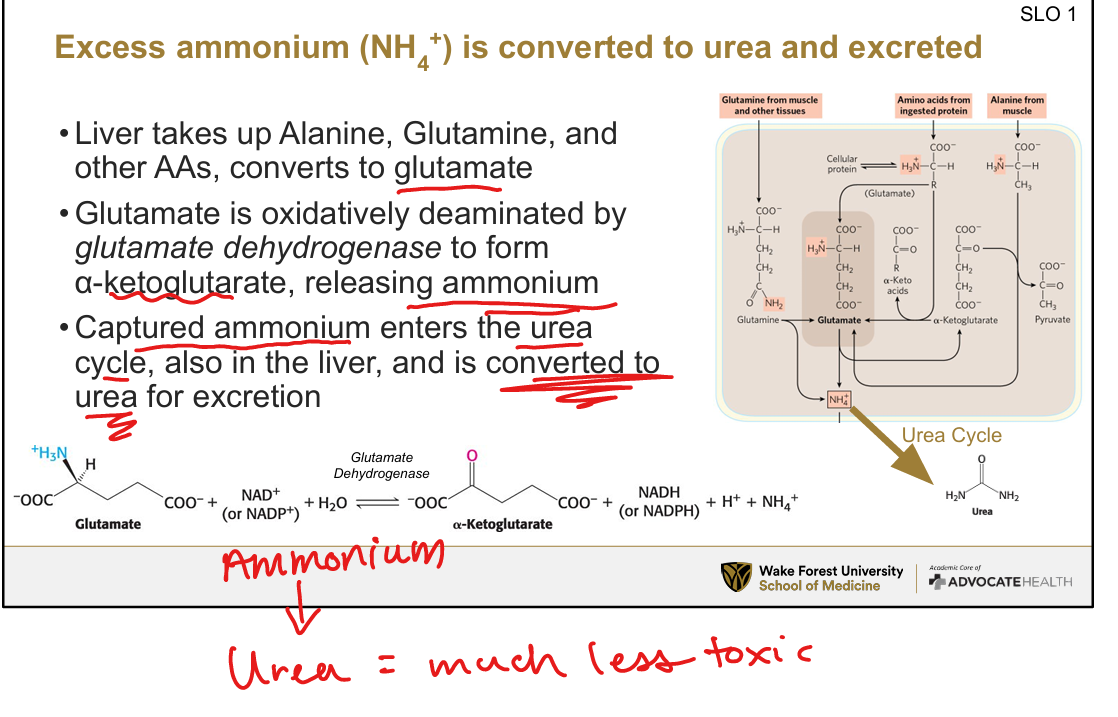 Receives amino groups via transamination; can be deaminated to release NH₄⁺