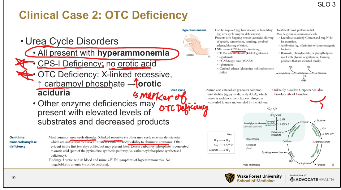 OTC Deficiency= orotic aciduria bc inc in carbamoyl phosphate