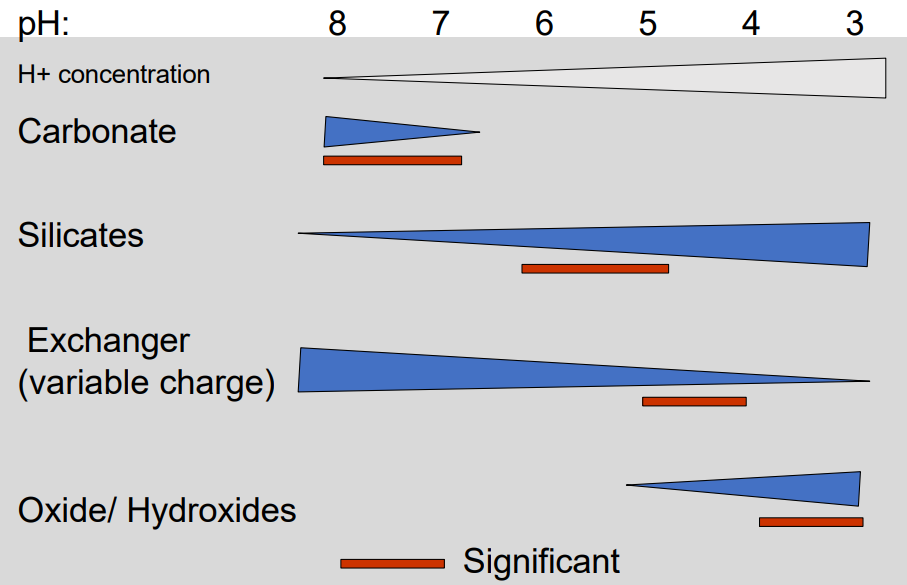 pH buffering by silicate minerals (especially clays) via surface silanol groups (Si–OH).