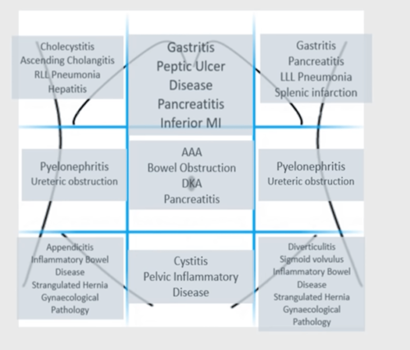 -Sx: Upper abdominal pain, pain that radiates to your back, pain that is worse after eating, N/V, tenderness